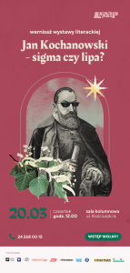 20 marca, godz.12.00 – Otwarcie wystawy literackiej „Kochanowski – sigma czy lipa?” prezentującej postać i twórczość ojca poezji polskiej, wybitnego poety, tłumacza i dramaturga epoki renesansu, o którym pisarz Wiesław Myśliwski powiedział, że dokonał kopernikańskiego przełomu, wyprowadzając polszczyznę z cienia języka mówionego i wprowadzając ją do pisma.